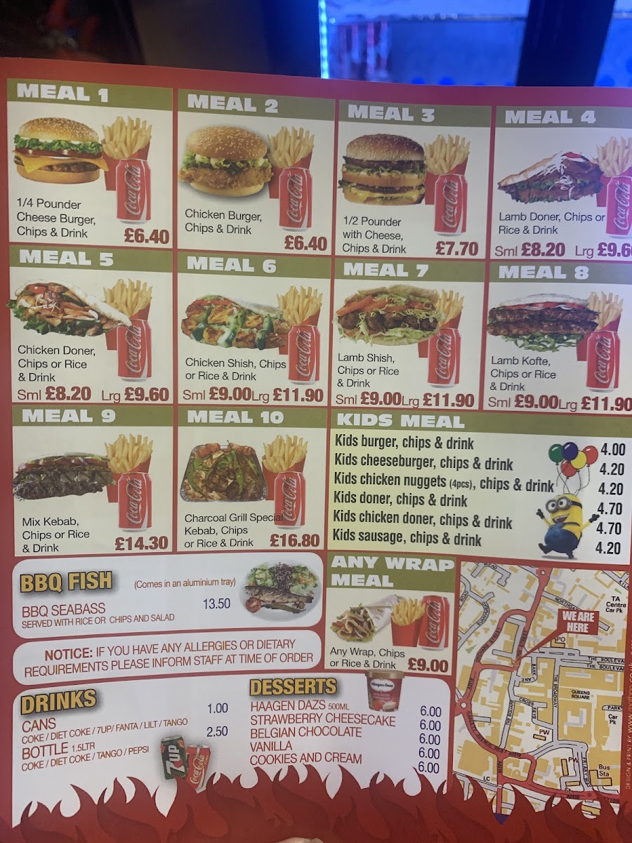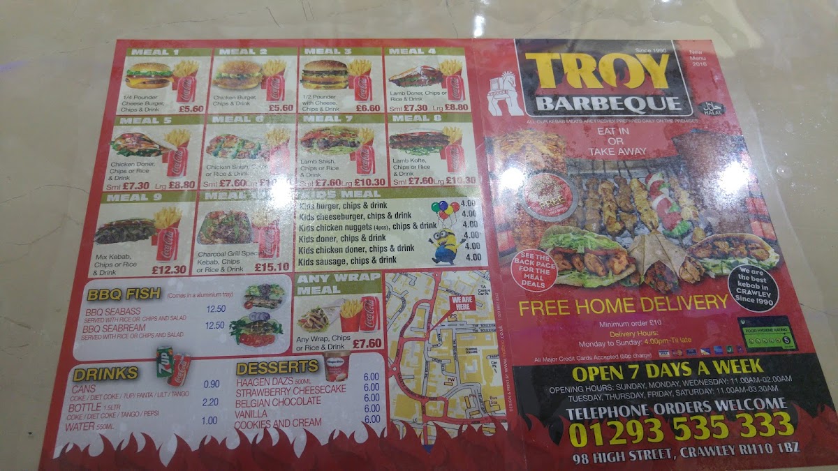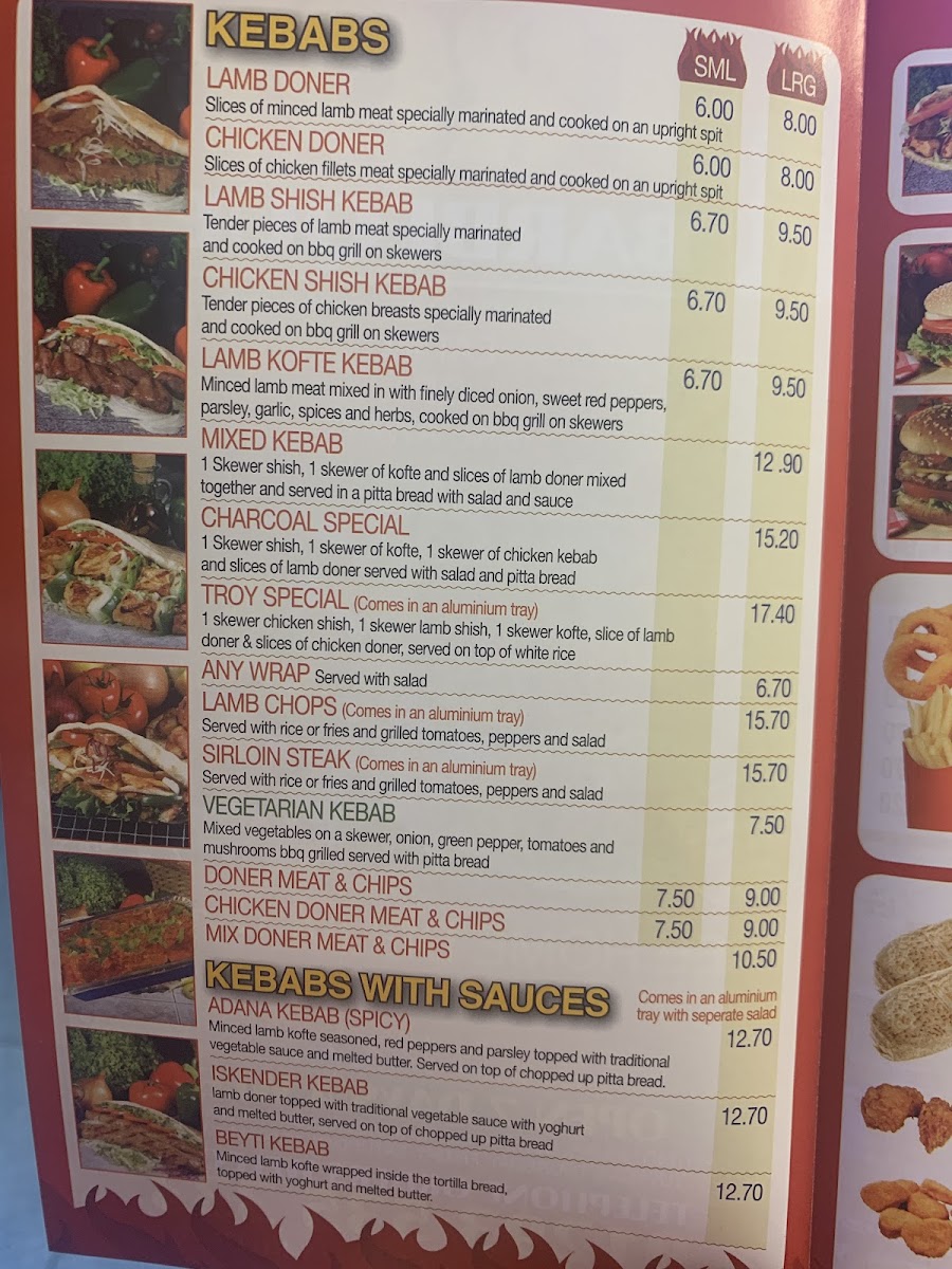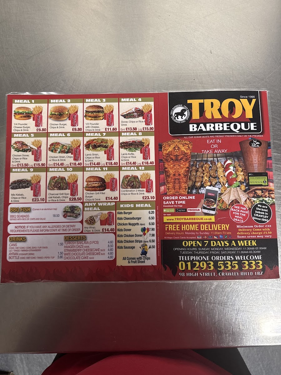 From a reviewer’s perspective, the menu at Troy Barbeque offers a wide and satisfying range of classic takeaway favourites, making it easy to find something for every appetite. The starters such as Small Chips, Large Chips, Mix Salad Box Rice, and Onion Rings are simple but reliable choices to begin with, while the burger selection includes hearty options like the Quarter Pounder Burger, Quarter Pounder Burger With Cheese, Half Pounder Burger, Half Pounder Burger With Cheese, and Chicken Burger. The kebab section stands out with flavourful options such as the Small Meat Doner Kebab, Large Meat Doner Kebab, Spicy Adana Kebab, Iskender Kebab, and Beyti Kebab, along with customizable Combination Of Any Two Kebab or Combination Of Any Three Kebab. There are also seafood choices like Bbq Seabass With Rice and Bbq Seabass With Chips, plus plenty of extras, kids meals, and meal deals for good value. To finish, desserts like 3 Pcs Turkish Baklava Pistachio and 500 Ml Haagen Dazs Strawberry Cheese Cake Ice Cream pair nicely with drinks such as Coke Can or Sprite Can, rounding out a menu that is varied, filling, and well-suited for casual dining.