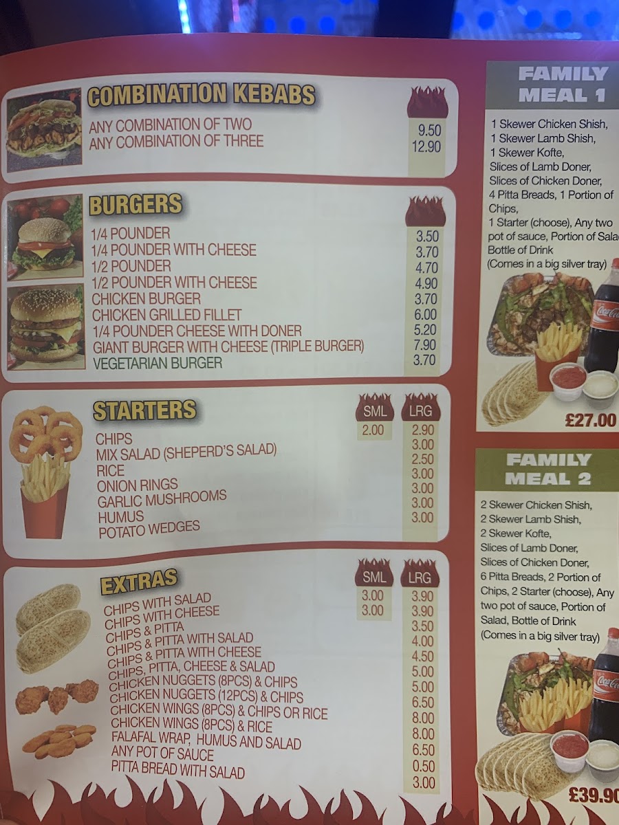 Comes in a Big silver tray. Chicken shish skewer, Lamb shish skewer, Kofte skewer, Slice of lamb doner, slice of Chicken doner, 4x pitta breads, portion of chips, Any one starter, Any two pot of sauce, Portion of salad, bottle of Drink.